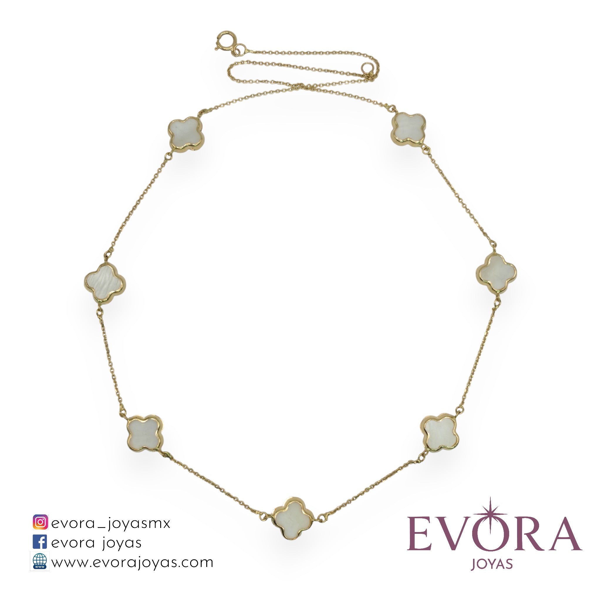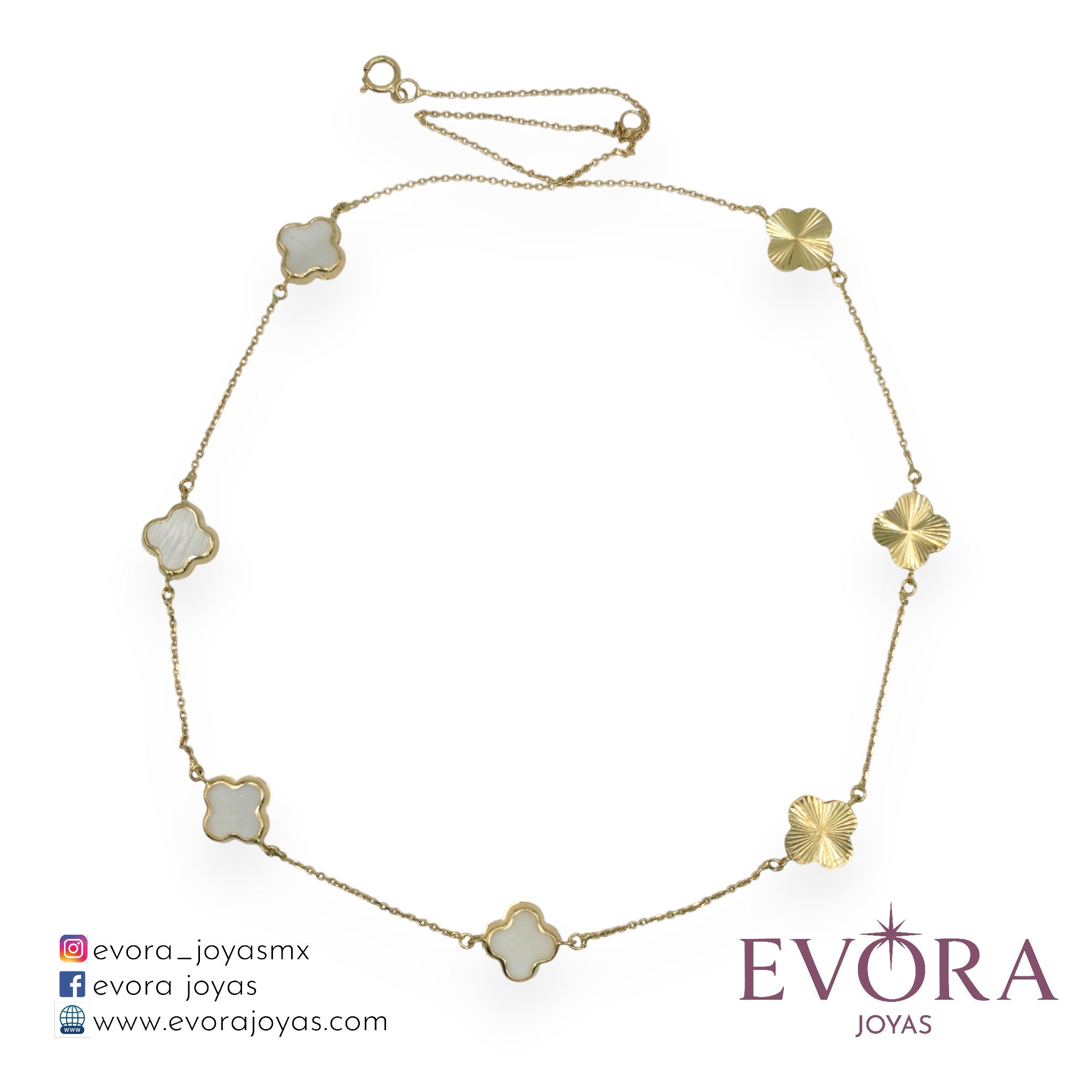 Sofisticada cadena modelo '7 Treboles Blancos', fabricada en oro Italiano de 10k.